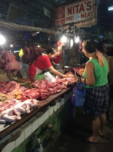 As we walk deeper into the warehouse past the fish vendors we come upon the the prutas at gulay (fruits and vegetables) stands. Their stands have many tiers. Fruits, vegetables, leaves, roots, and spices hang, drape and pile on every open surface. The fruits are strange, and one vendor rip open red fuzzy fruits for us to try. The flesh is white and so sweet we decide to buy a kilo, 90P lang. Collecting new fruits and vegetables along the way we walk even further to the carne vendors. These stands are far from the ambient light of the city but they still glow bright red and I get that eerily feeling that we’re walking into a horror movie. Every part of the animal hangs from giant silver hooks or is set out on silver platters. The vendors wear a white apron stained pink by their work and swing a giant cleaver to chop up kilos of meat.